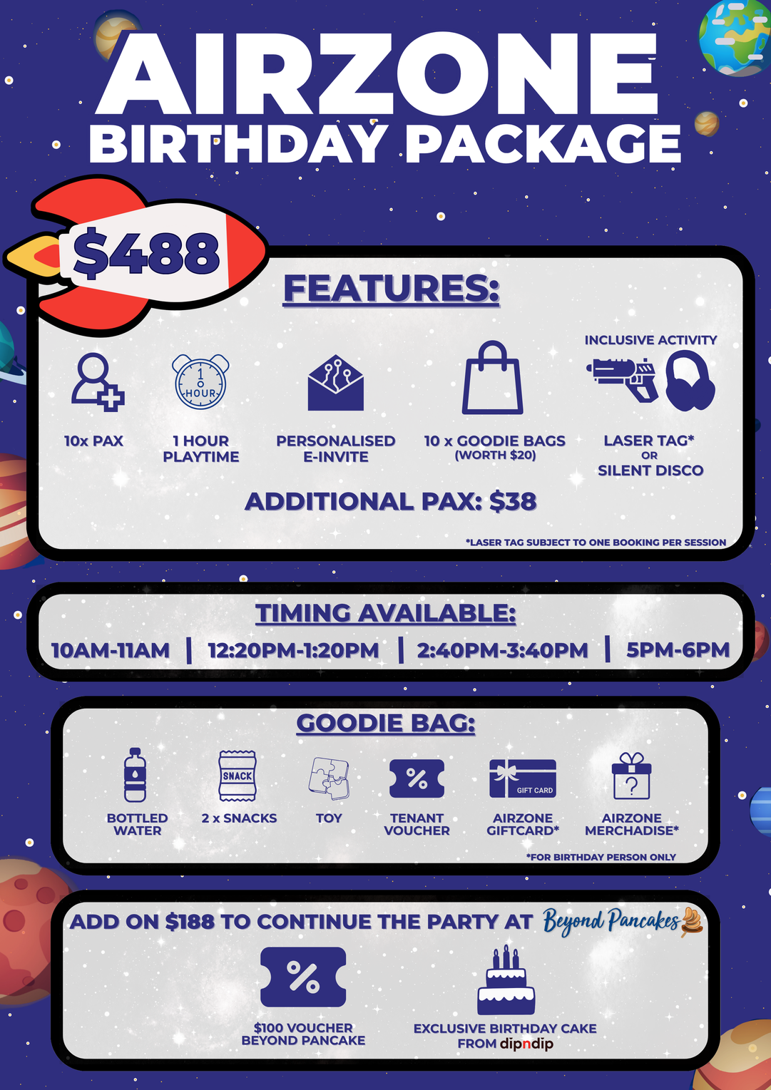 Drinks will be given out before the session and the birthday girl or boy will receive 1 AIRZONE giftcard and exclusive gift.