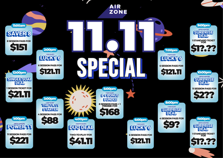 All Day Play Pass is valid for 1 person entry to unlimited AIRZONE sessions in one day (date of purchase). Pass includes 1 drink and 1 pair of socks.